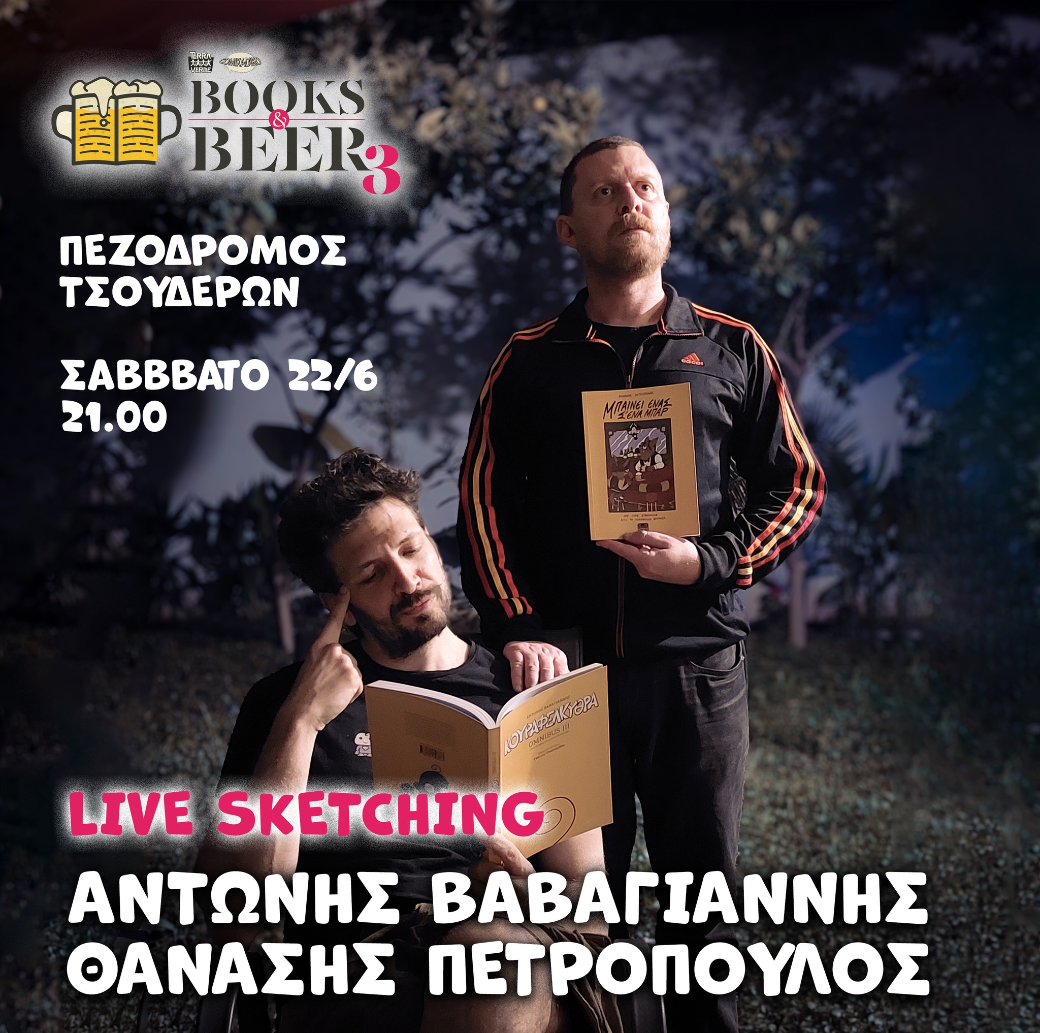 Το Σάββατο 22 Ιουνίου, στις 21.00 στον πεζόδρομο της Τσουδερών, στο πλαίσιο του Books & Beers, θα πραγματοποιηθεί ένα ξεχωριστό Live Sketching με τον Αντώνη Βαβαγιάννη και τον Θανάση Πετρόπουλο !!